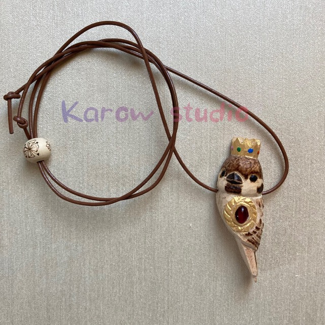 冠をかぶったスズメの王様。キラキラの石でかわいい威厳たっぷりです。王冠と石の装飾はアクリル着彩。スズメ本体の色はバーニングのみで表しています。 一雫(ひとしずく) 木彫りのペンダントトップに天然石が埋め込まれているシリーズです。 ボンドなどは一切使わず象嵌技法で木に天然石が埋め込まれています。木と石が一体となり、一雫(ひとしずく)となってきらめきます。 手彫りのため二つとして同じものはありません。 紐は上質な革紐で金属アレルギーの方でも安心です。金具を使わずにペンダントトップに直接通しているため、落としにくい仕様となっています。首の後ろで調節するためのビーズにも一点一点ウッドバーニングを施し一点ものにこだわりました。アクリル着彩。木製で大変軽いため、ご自分で組み合わせて複数着用することもできます。紐の長さを調節することでバッグチャームとしてもお使いいただけます。 一雫の彩りときらめきをお楽しみください。 ペンダントトップ 1体 革紐 約70cm ウッドビーズ 1個 のセットです。 オプションでブローチ金具の取り付けが可能です。オプションよりお選びください。