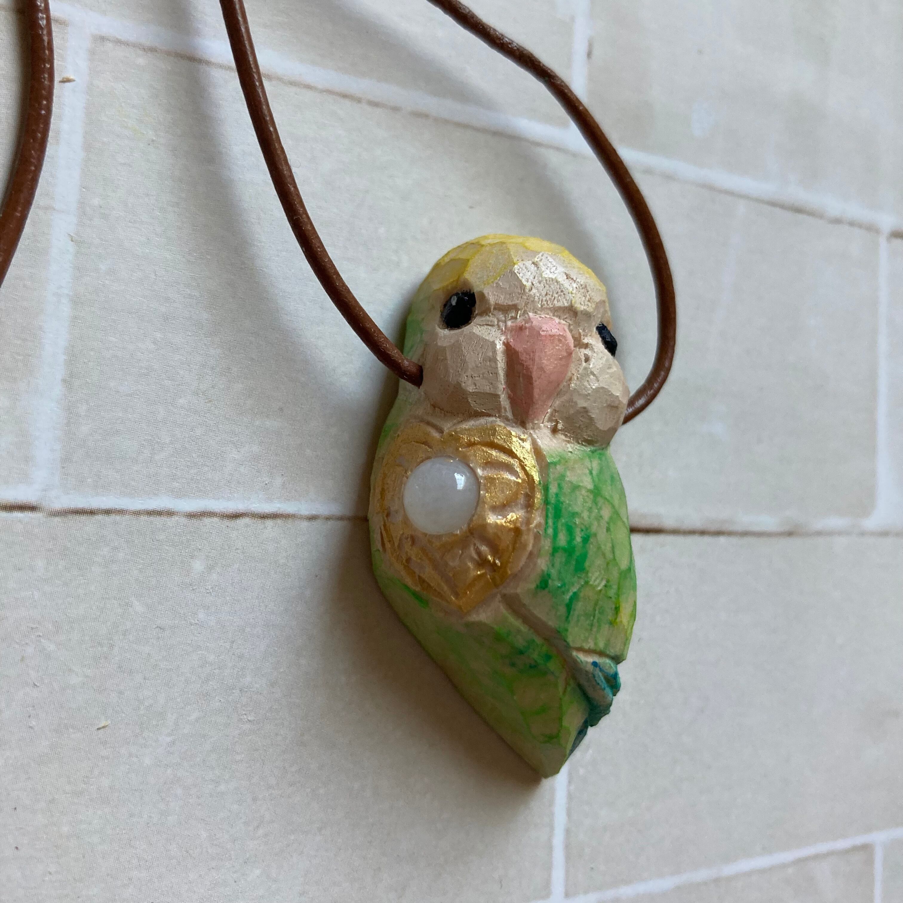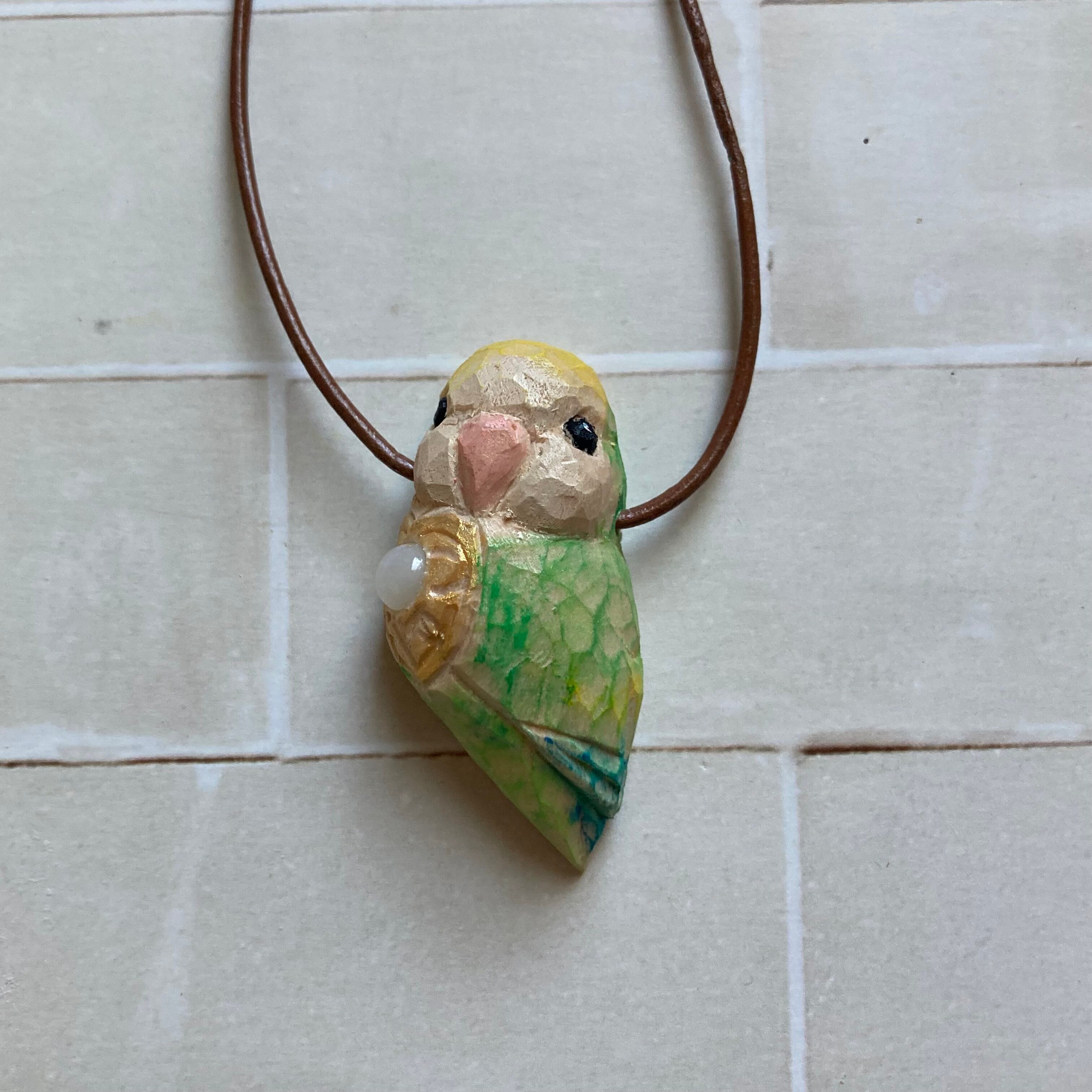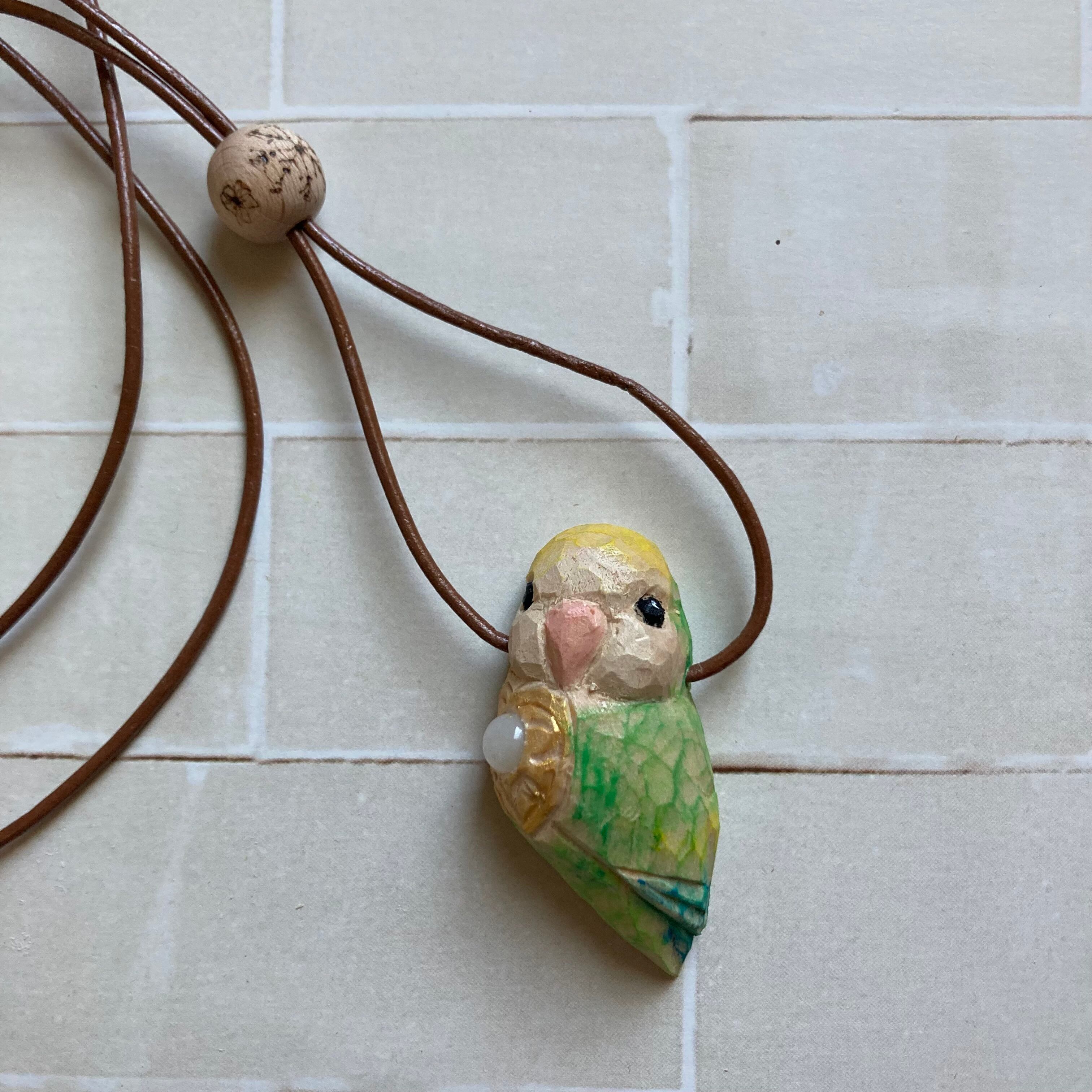 紐は上質な革紐で金属アレルギーの方でも安心です。金具を使わずにペンダントトップに直接通しているため、落としにくい仕様となっています。首の後ろで調節するためのビーズにも一点一点ウッドバーニングを施し一点ものにこだわりました。アクリル着彩。木製で大変軽いため、ご自分で組み合わせて複数着用することもできます。紐の長さを調節することでバッグチャームとしてもお使いいただけます。
