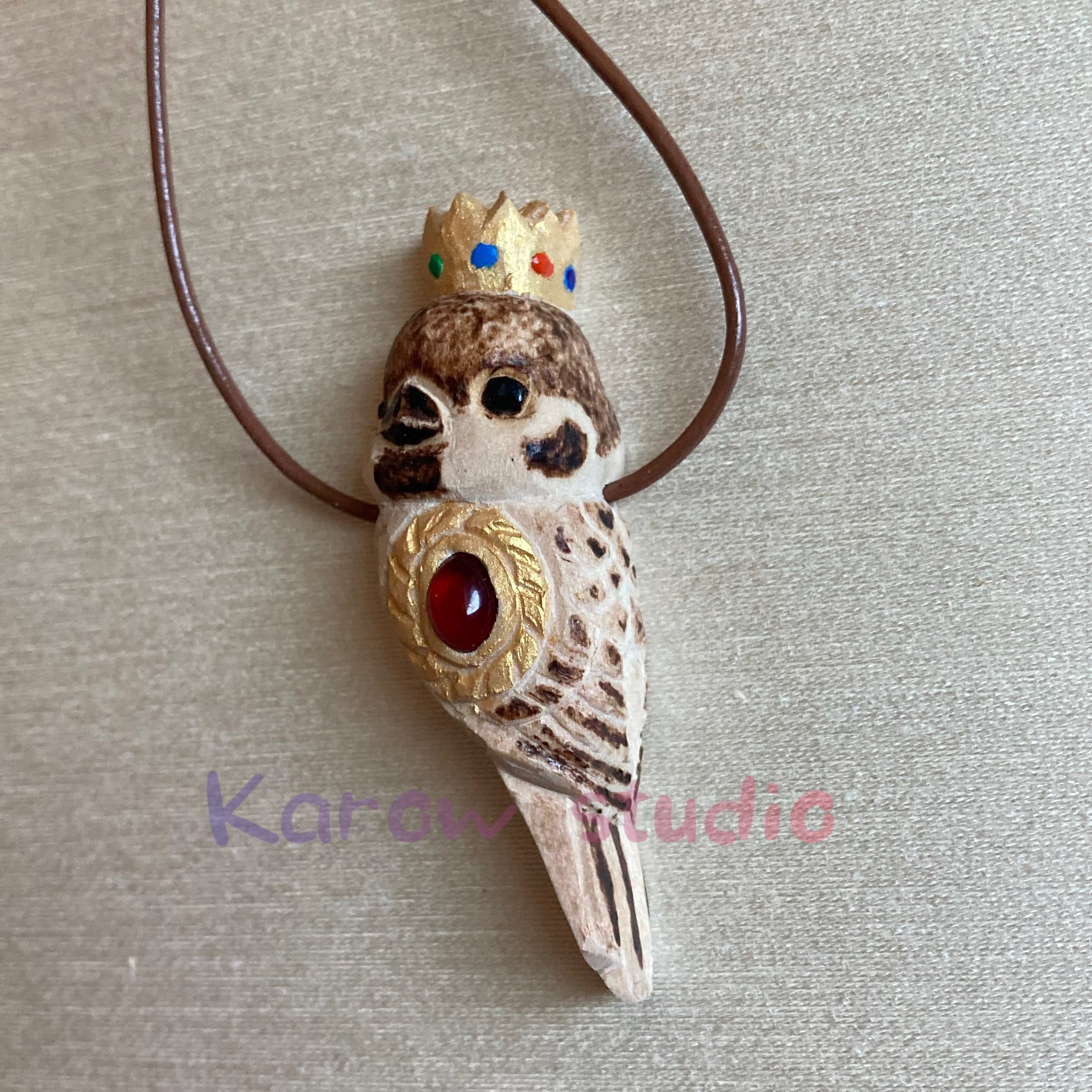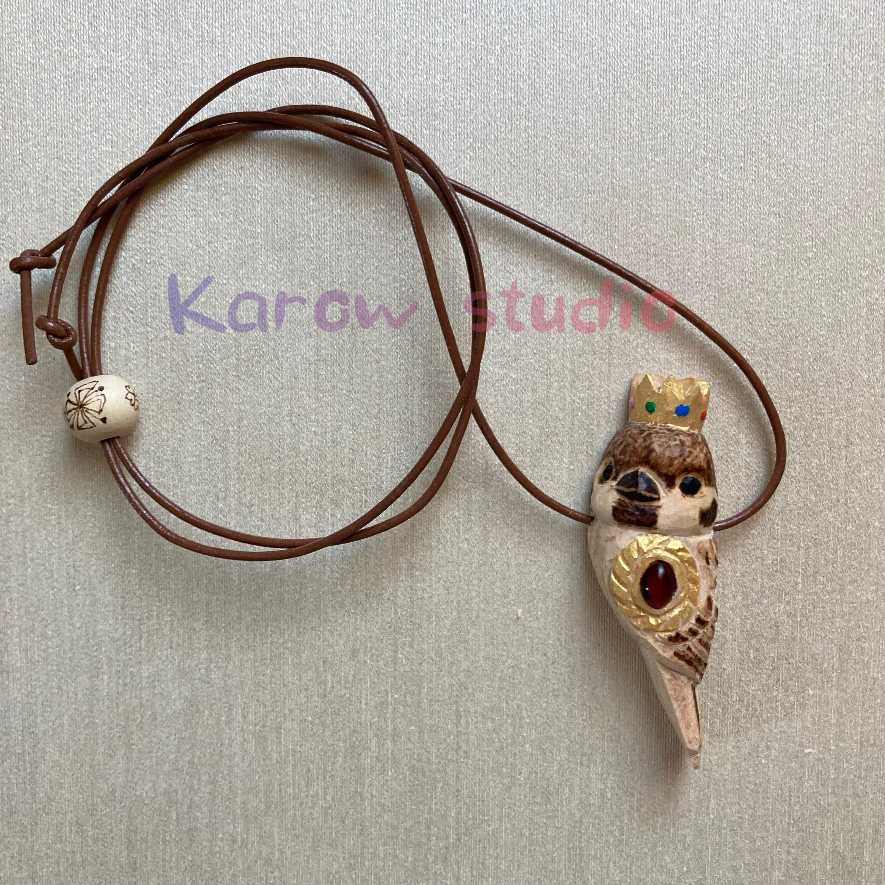 冠をかぶったスズメの王様。キラキラの石でかわいい威厳たっぷりです。王冠と石の装飾はアクリル着彩。スズメ本体の色はバーニングのみで表しています。