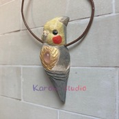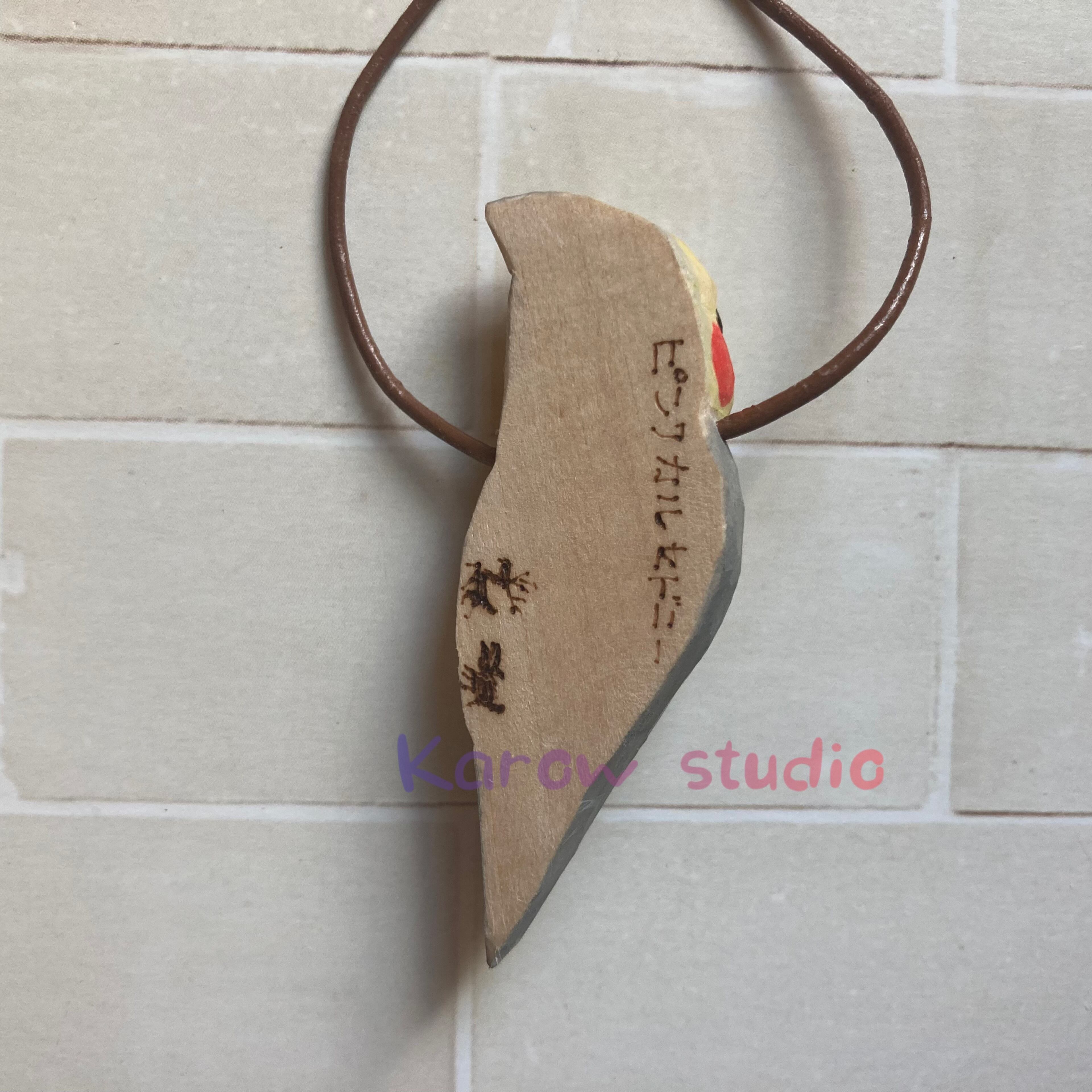 紐は上質な革紐で金属アレルギーの方でも安心です。金具を使わずにペンダントトップに直接通しているため、落としにくい仕様となっています。首の後ろで調節するためのビーズにも一点一点ウッドバーニングを施し一点ものにこだわりました。アクリル着彩。木製で大変軽いため、ご自分で組み合わせて複数着用することもできます。紐の長さを調節することでバッグチャームとしてもお使いいただけます。