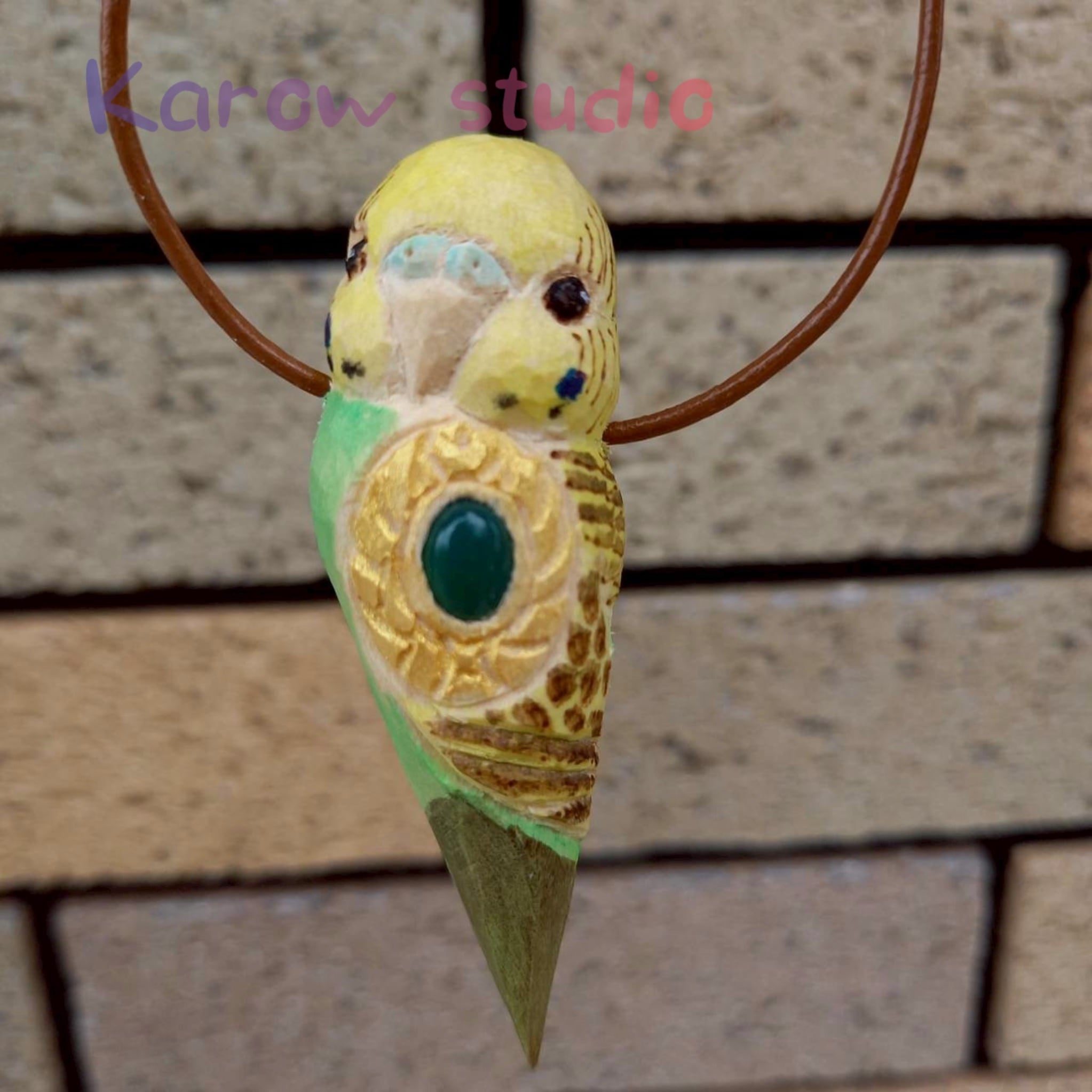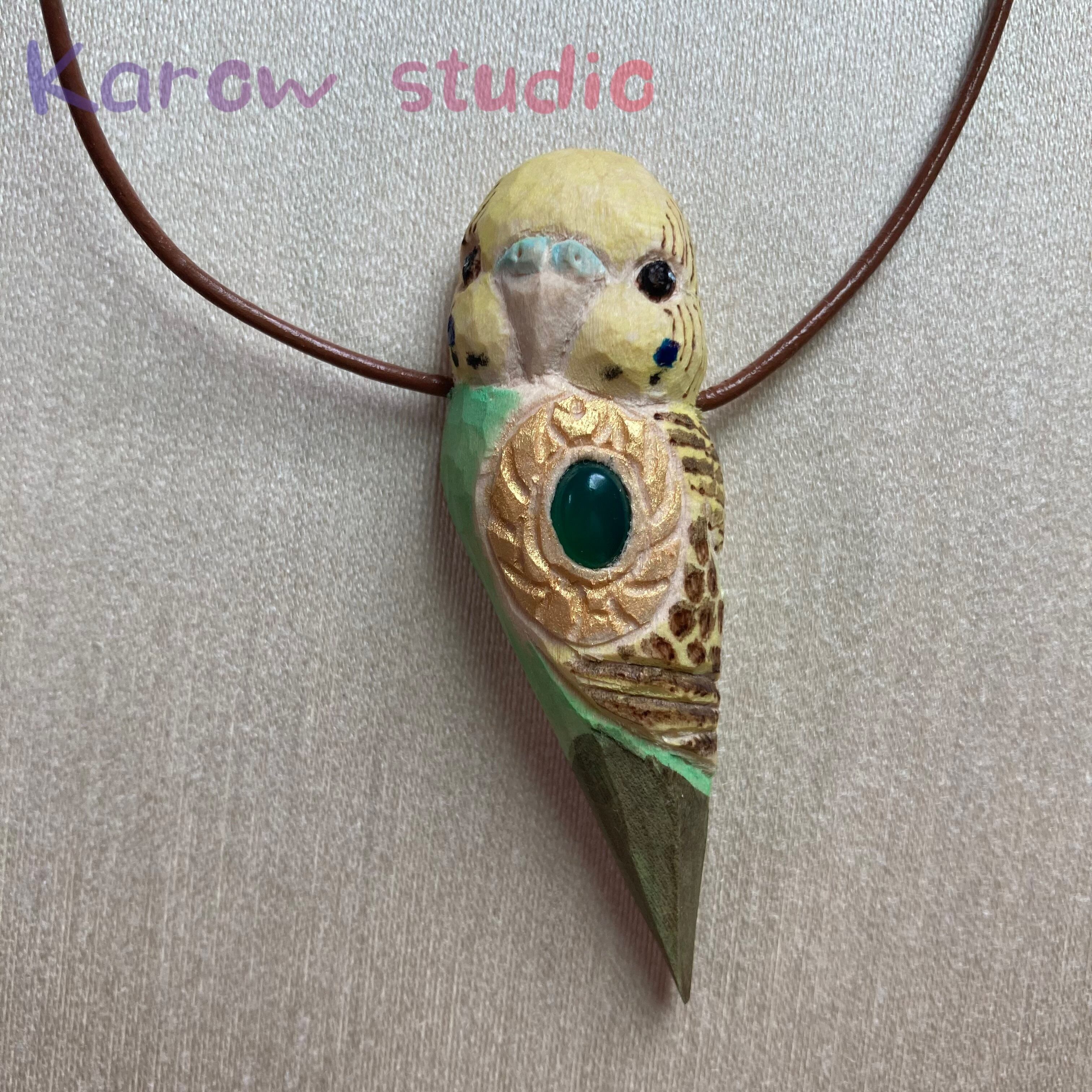 セキセイノーマルはシマシマが魅力。バーニングと彩色併用でシマシマを表現しました。木ならではの表現になります。やや淡い色彩にしています。