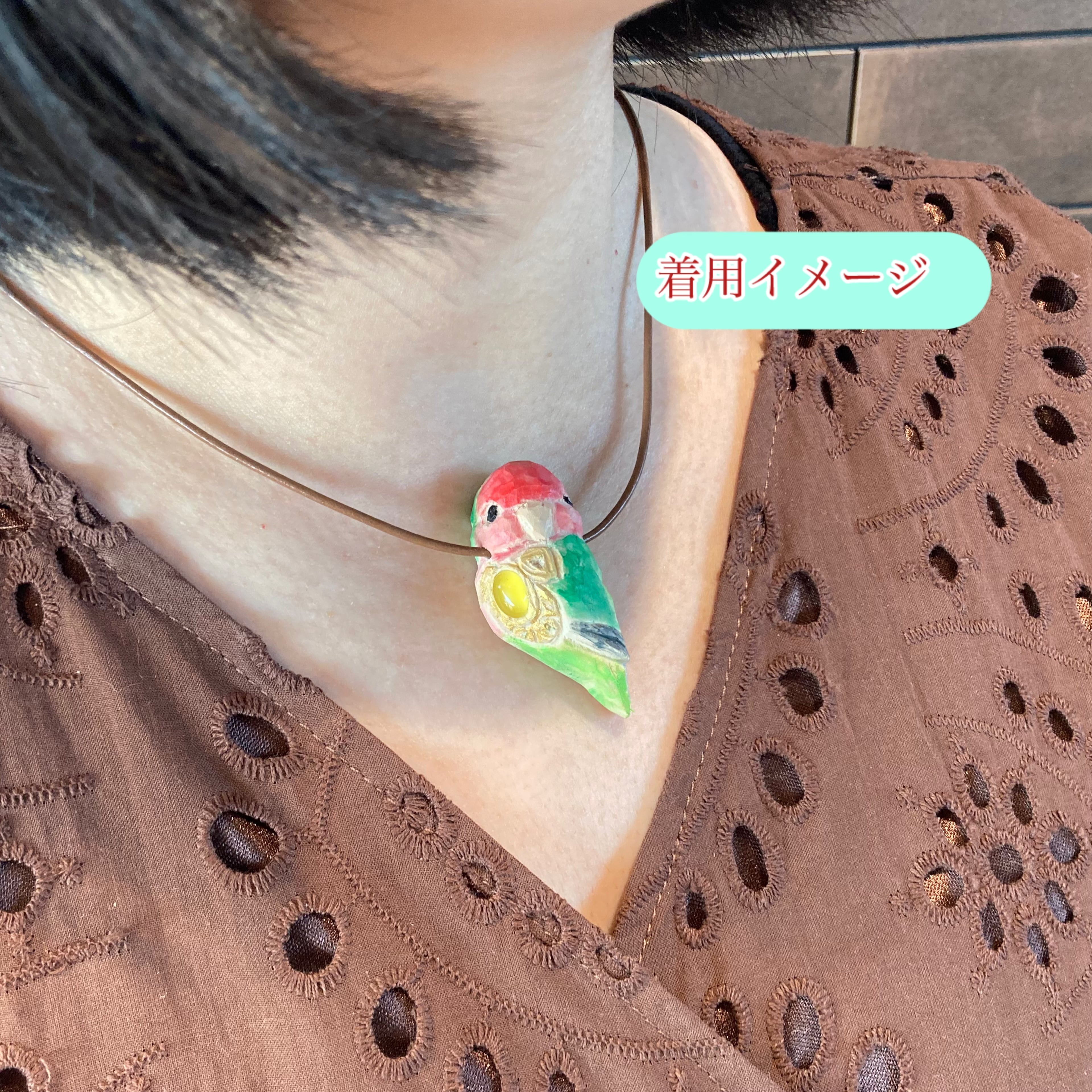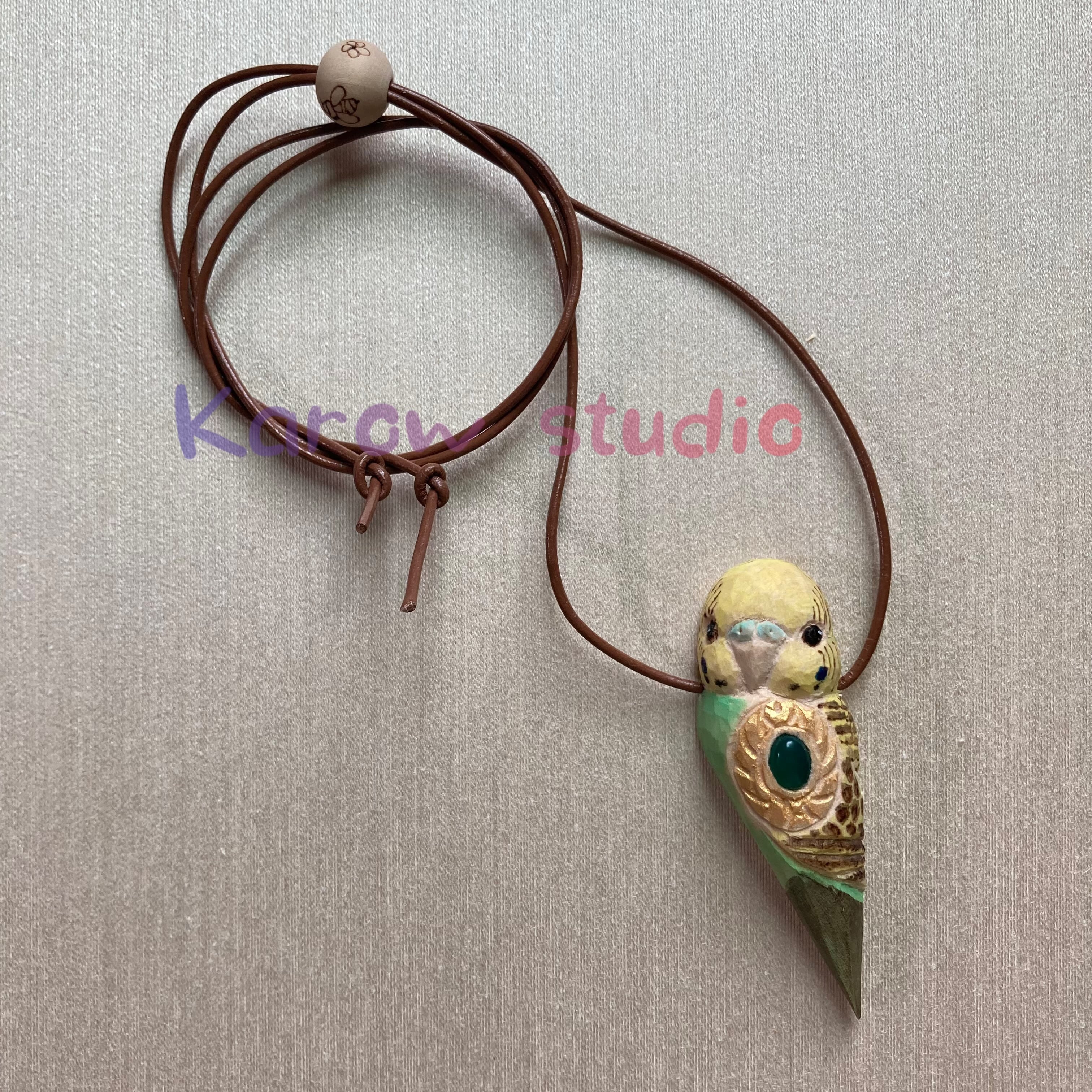 紐は上質な革紐で金属アレルギーの方でも安心です。金具を使わずにペンダントトップに直接通しているため、落としにくい仕様となっています。首の後ろで調節するためのビーズにも一点一点ウッドバーニングを施し一点ものにこだわりました。アクリル着彩。木製で大変軽いため、ご自分で組み合わせて複数着用することもできます。紐の長さを調節することでバッグチャームとしてもお使いいただけます。